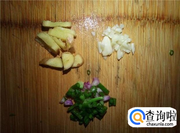 准备好所有材料:竹笋、瘦肉、姜、蒜、葱。