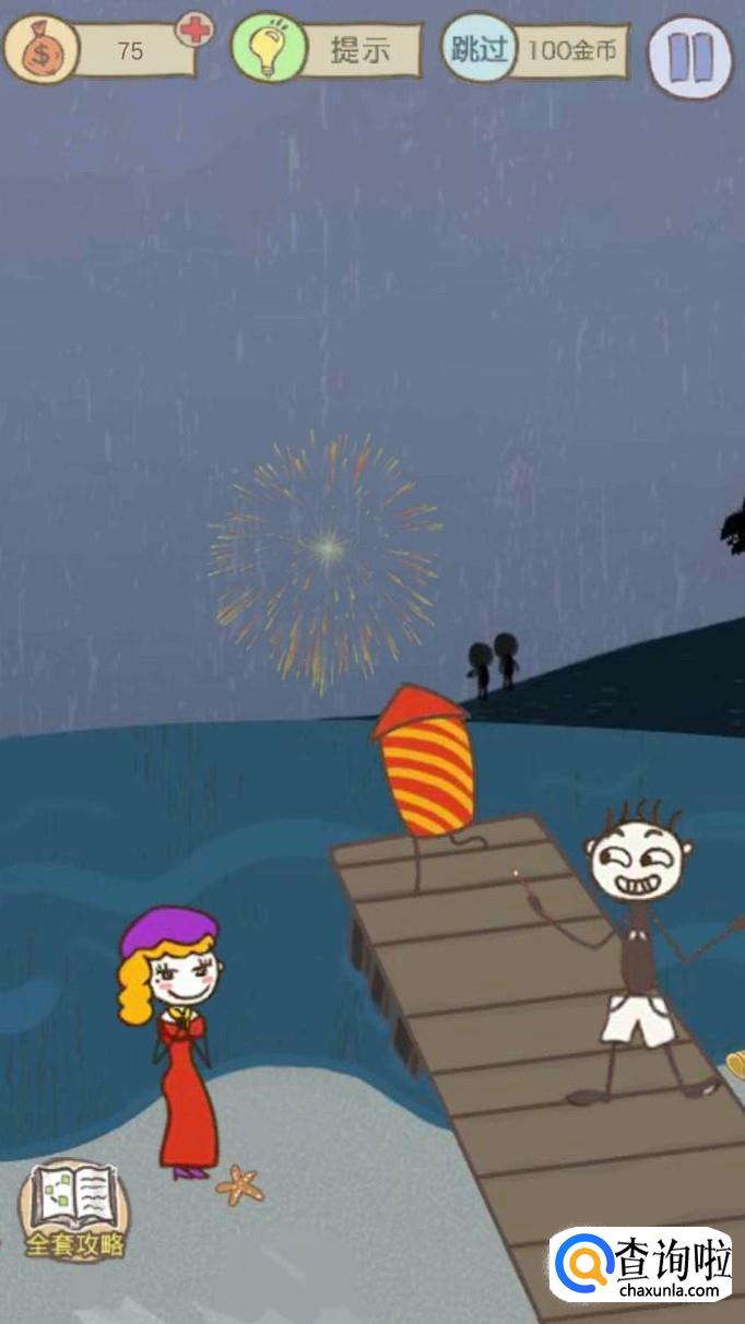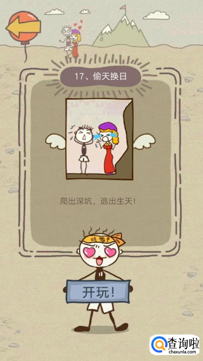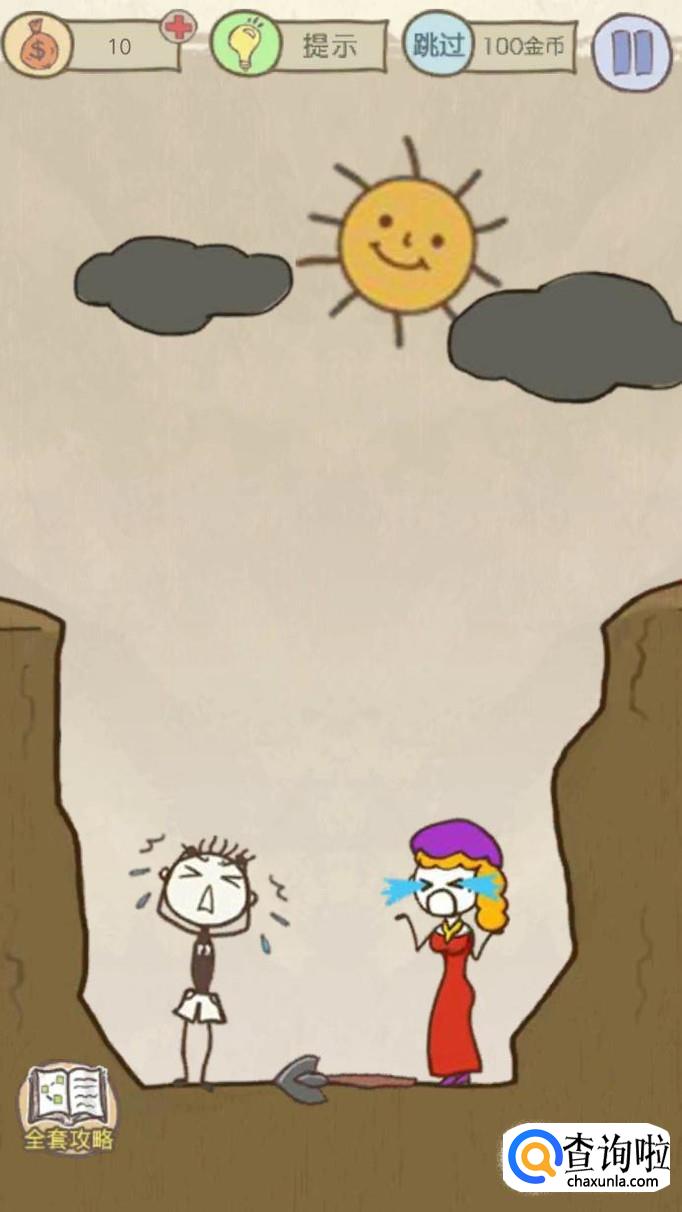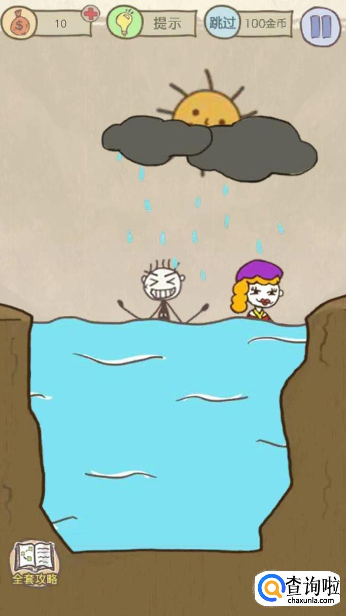 第十七关:把太阳两边的乌云移到太阳上,把太阳遮起来,然后就会下雨,雨水堆积之后,可以让史小坑和女神浮起来,就可以从深坑里出来了。