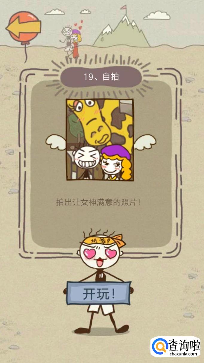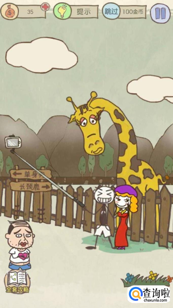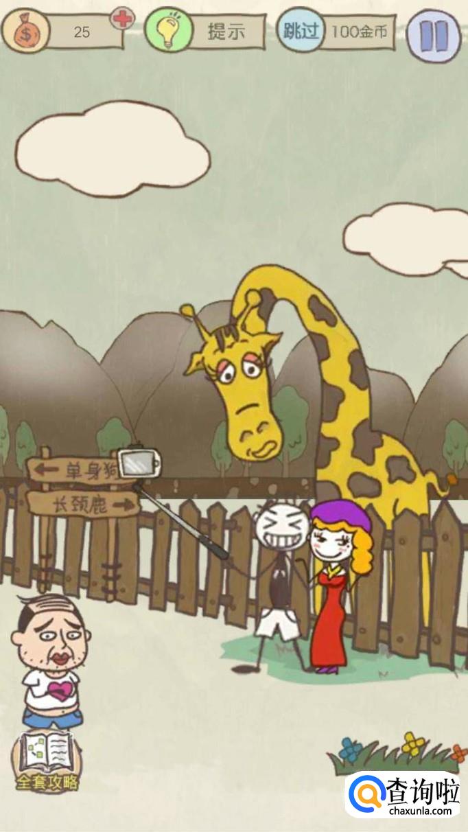 第十九关:自拍的时候,玩家们用手指把史小坑的自拍杆拉长,这样拍照的时候,就可以把长颈鹿拍进去,成为让女神满意的照片哦。