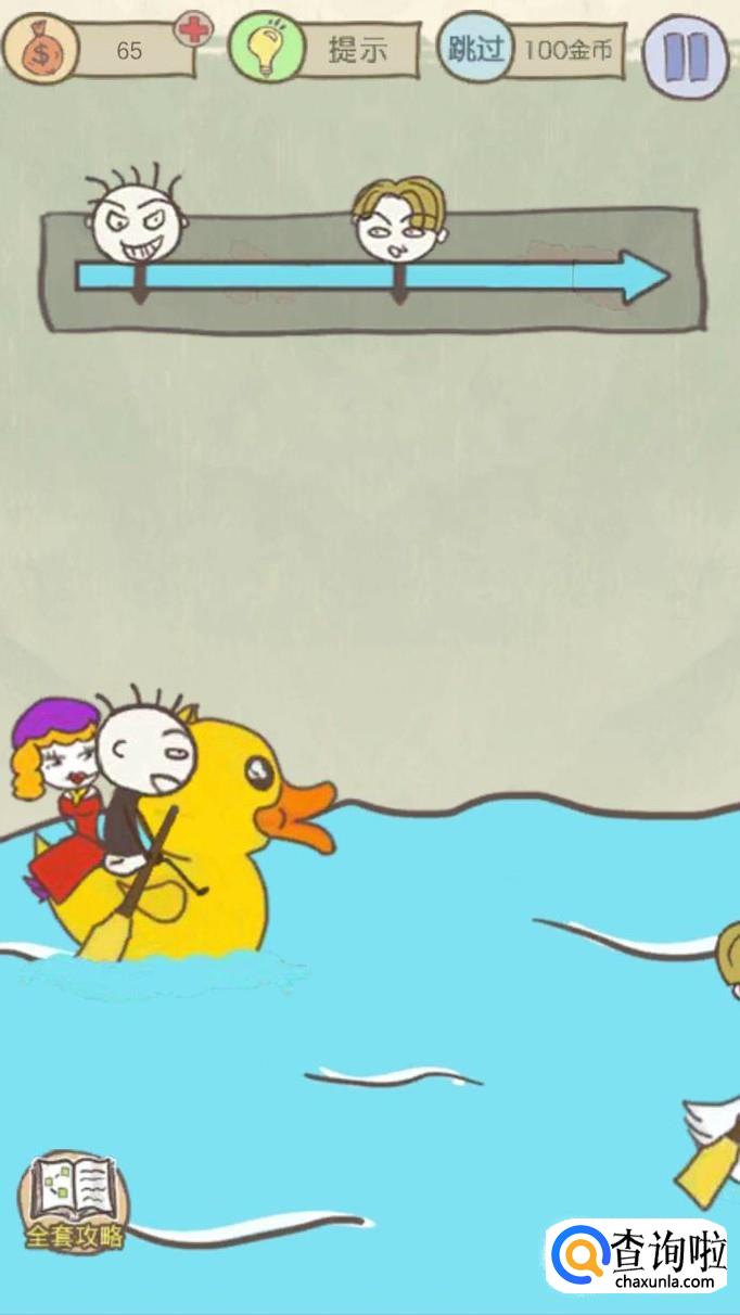 第二十三关:将蓝色的箭头条前面的箭头移下来,然后戳破史小坑骑的鸭子,鸭子就会因为漏气而飞的很快。