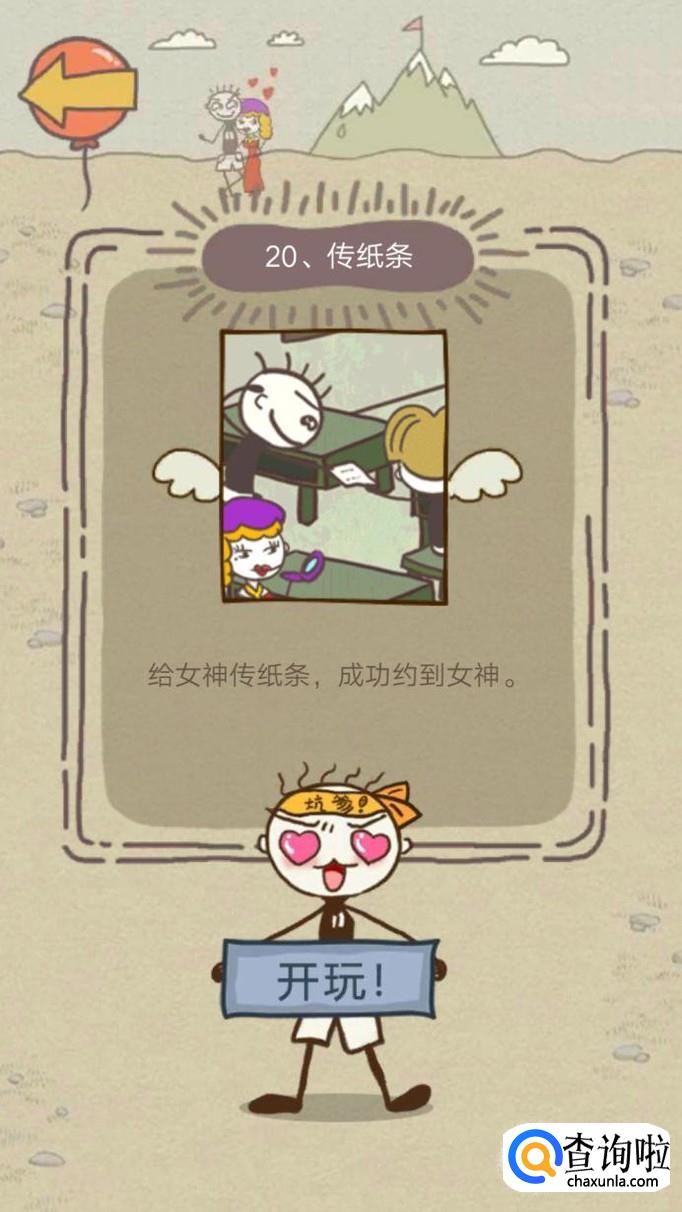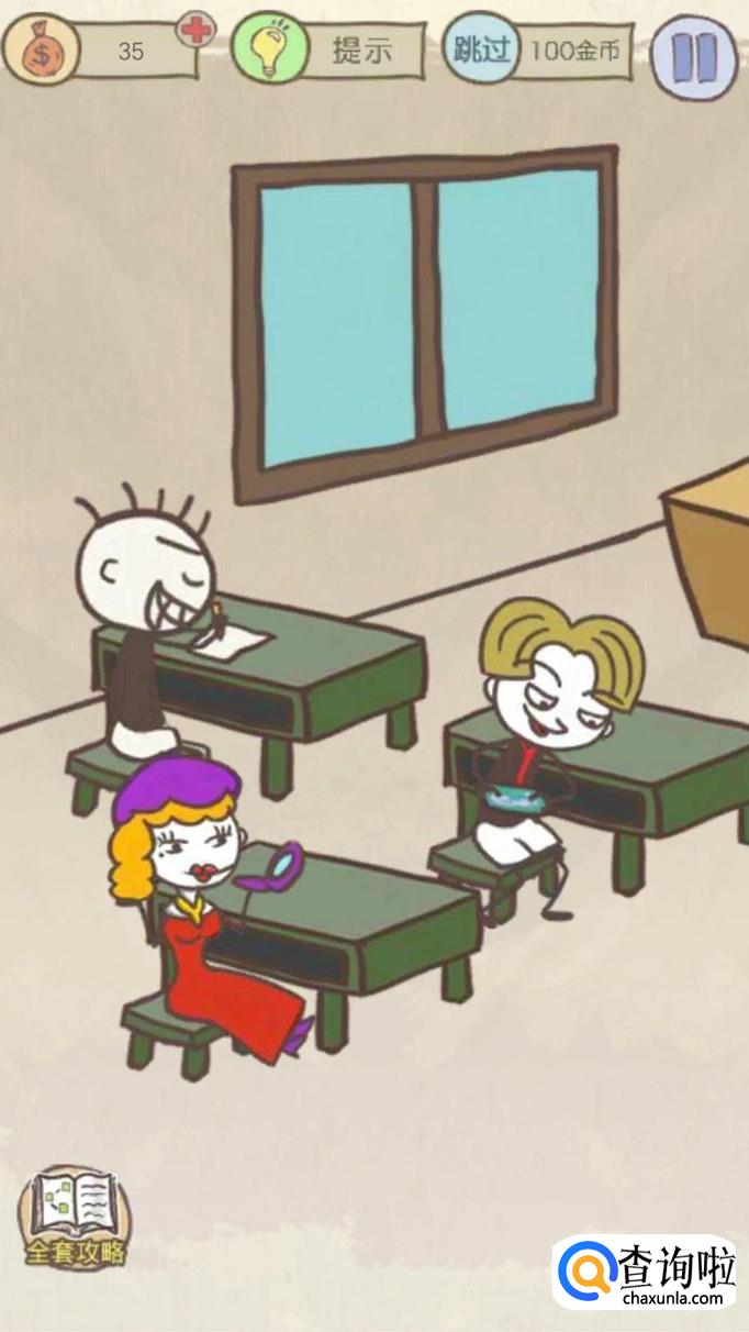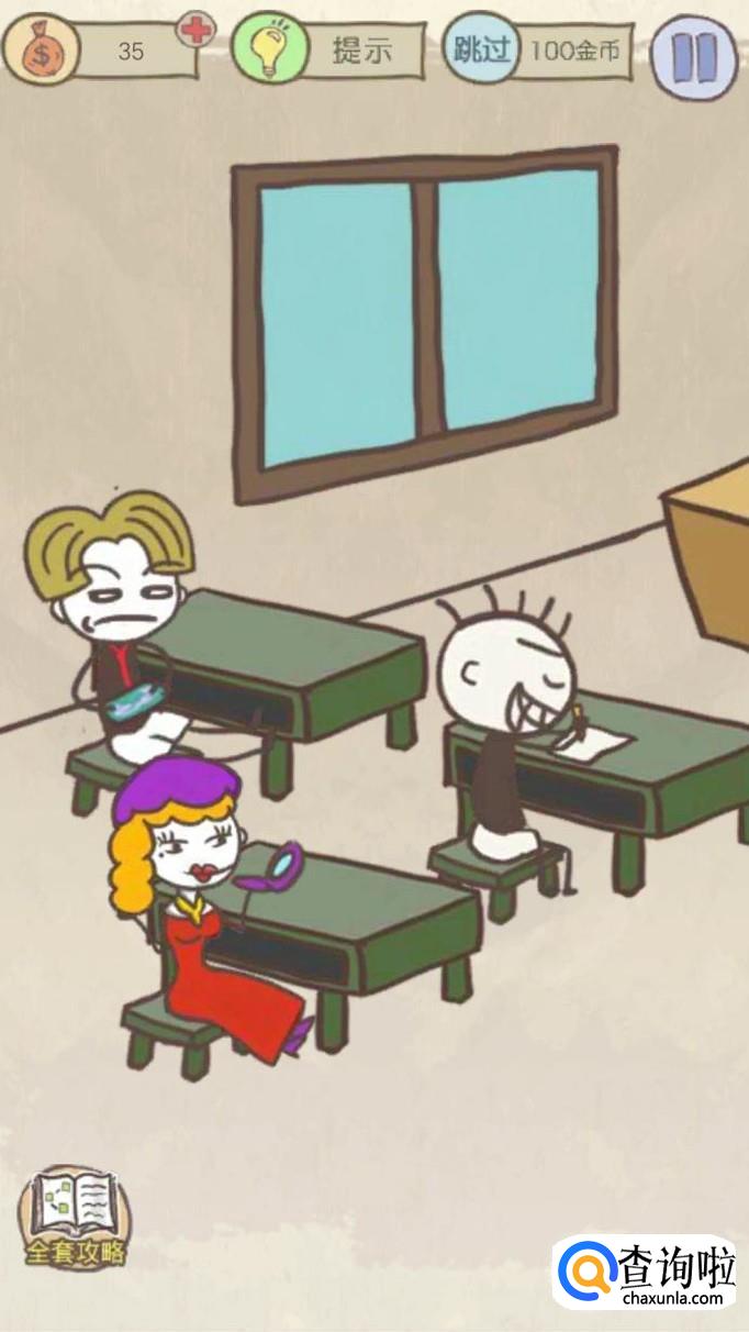 第二十关:把史小坑和黄发男换个位置既可。具体操作就是:用手指按着史小坑,然后移到黄发男的位置,就可以成功换好位置,然后传纸条不就很方便了吗?