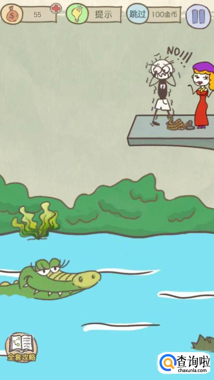 第二十二关:将鳄鱼上方的水草移到史小坑身上,然后点击史小坑,因为戴着水草,所以鳄鱼以为是怪物,就会逃跑,这样史小坑就过关啦!