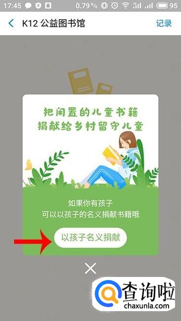 进入公益图书馆界面,查看相应的推送信息,点击“以孩子名义捐献”