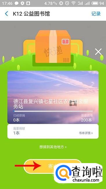 拖到快递箱之后,会弹框提示相应的目的地信息,想要还目的地的话选择“想捐到其他地方”,然后直接点击“寄出”就行了。