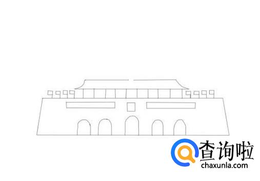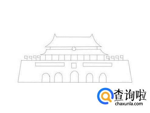 再在天安门的画出第二层的城楼,然后在城楼的两侧画出小的旗子,如图所示: