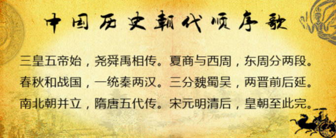 三皇五帝始,尧舜禹相传;夏商与西周,东周分两段;春秋和战国,一统秦两汉;三分魏蜀吴,二晋前后沿;南北朝并立,隋唐五代传;宋元明清后,皇朝至此完。朝代的名称大致有五个来由:由部族、部落联盟的名称而来,来自创建者原有卦号、爵位;源于创建者原始所或政权统治的区域;源于宗族关系;寓意吉祥。