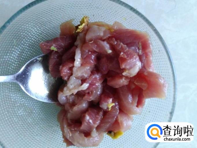 把瘦肉切成丝,加盐、姜蓉、生抽腌制几分钟。