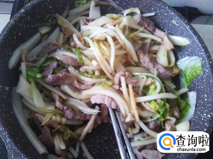 粉利铺在菜面上,盖上盖子焗3分钟。【粉利放在菜面焗软,炒的时候就不会断碎】