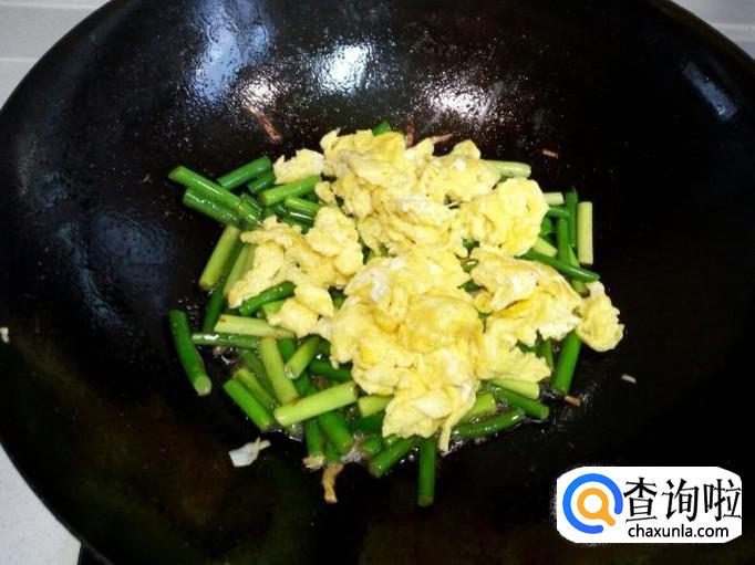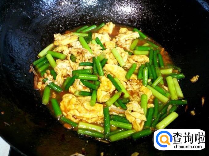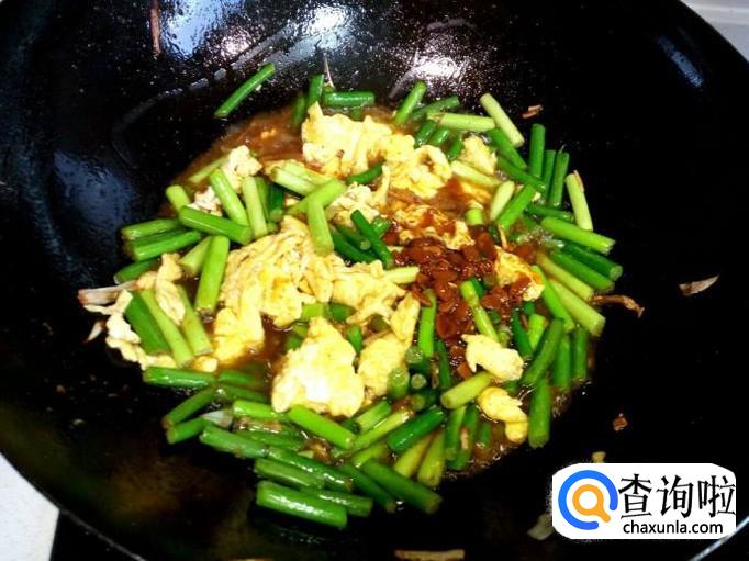 炒至蒜薹断生,放入炒好的鸡蛋,略翻炒一下,然后把稀释好的豆酱倒入锅中。