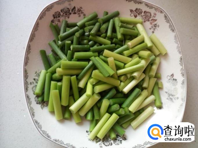 蒜薹收拾清洗干净,控干水分,切成寸段。