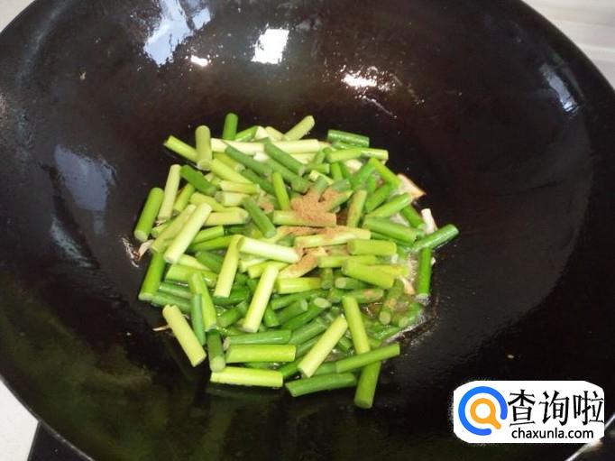 锅里放入油加热,油热后放入葱,姜,爆锅,放入蒜薹翻炒,放入五香粉。