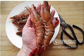 1、剪虾头,以45度的角度,从虾脑部向下剪除。