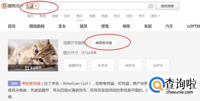 将图片上传进来之后,原来这只猫叫做美国折耳猫,点击【全部尺寸】,可以显示很多张清晰的照片,如下图所示: