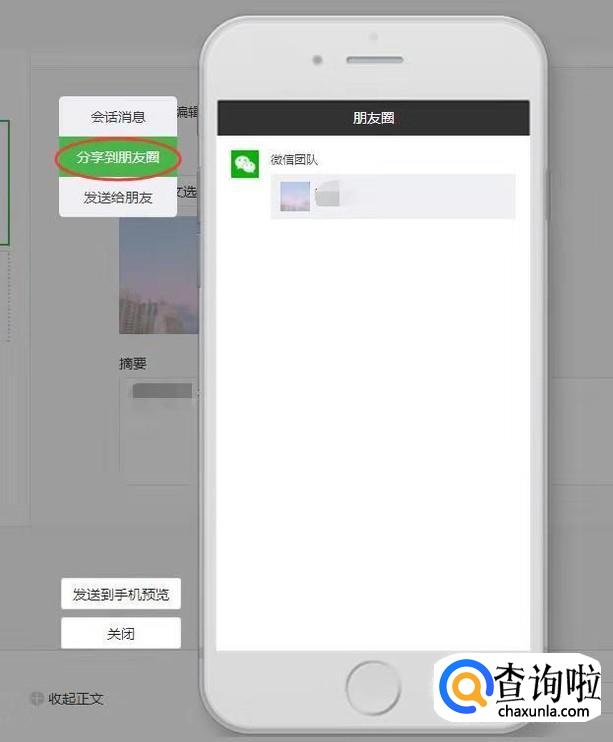 第二个“分享到朋友圈”,当你的文章写得好会有人分享出去,最直接的就是转发朋友圈,可以看到转发朋友圈你的文章链接预览方式。