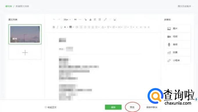 我们在微信公众号打开编辑好的文章素材,编辑好之后可以看到下面有一个“预览”,这里“预览”可以看到好几个不同的方式,下面会一一讲解。我这里的排版主要是靠左边为主,因为不是写段落格式的,你也可以居中为主。