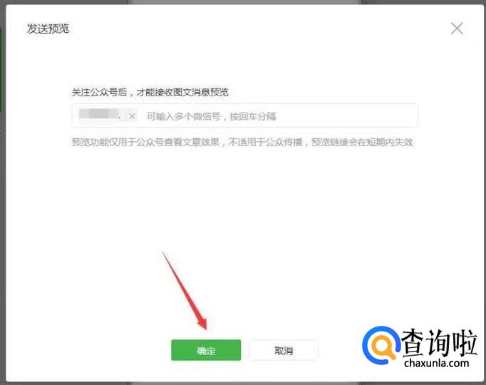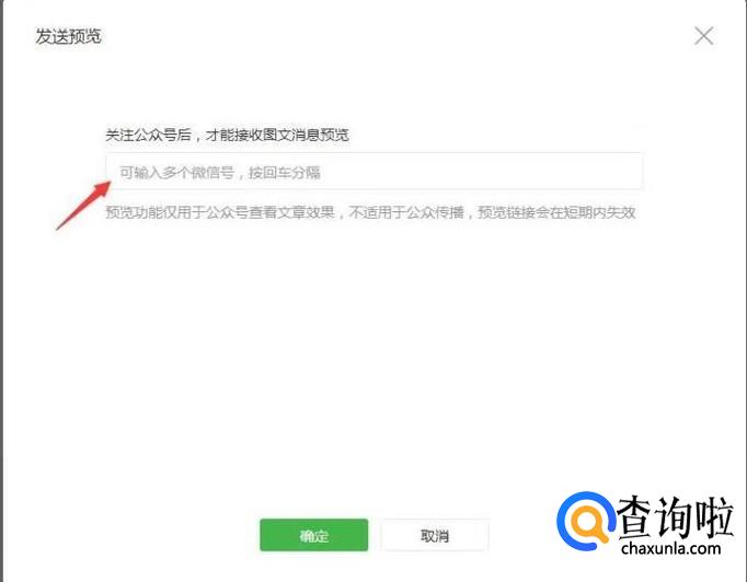 最后一个是“发送到手机浏览”,一般这个需要以自己公众号注册的微信号打开预览,就是发送到你的个人微信上,输入好要手机预览的微信号要点击下方的“确认”。