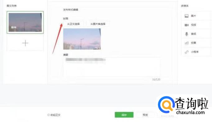 当文章里需要插图画进去的时候,记得上方空一行,下方空一行,这样排版出来才会比较好看,不会显得很拥挤,预览的时候你的封面图片要记得上传,只有上传好之后才可以预览,不然会打不开,也预览不了,这个要注意下。