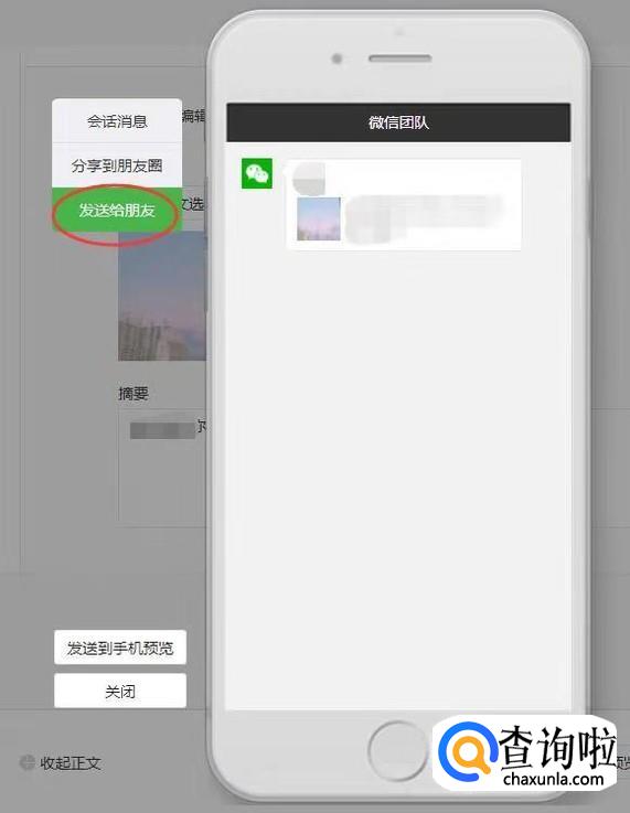 第二个“发送给朋友”,就是你将文章分享给好友之后,在你们聊天的对话框显示的样子。