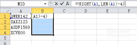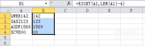 选中B1到B4单元格,然后,在编辑栏中输入:=RIGHT(A1,LEN(A1)-4)