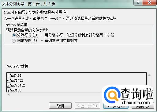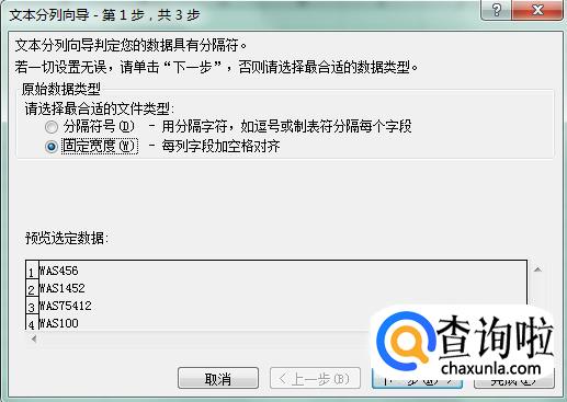 然后在弹出的分列向导中,点击“固定宽度”,再点“下一步”。