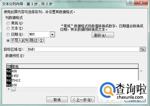 再点下一步,转到分列向导的第三步。点击“不导入此列(跳过)”,再点完成。