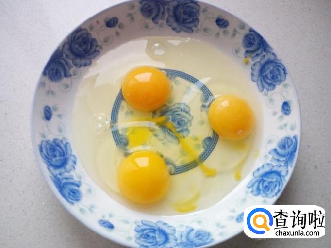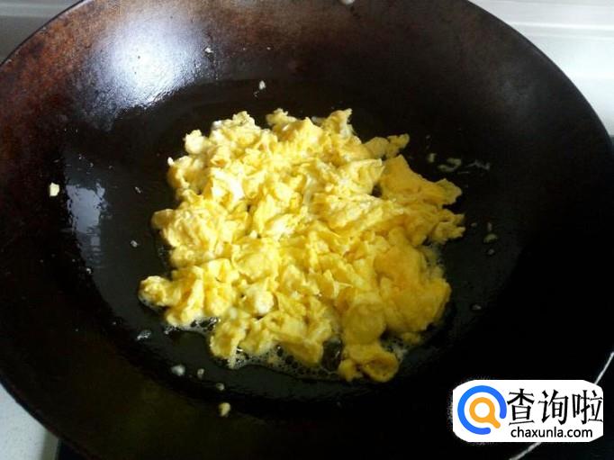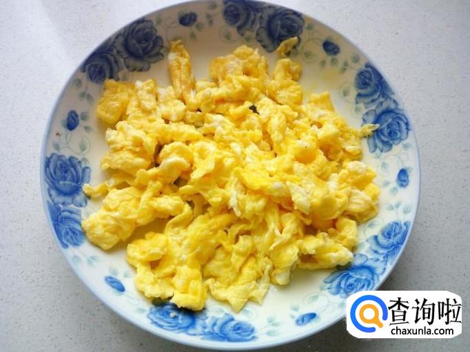 先用锅把鸡蛋炒出来,炒至七分熟即可,盛出装盘备用。