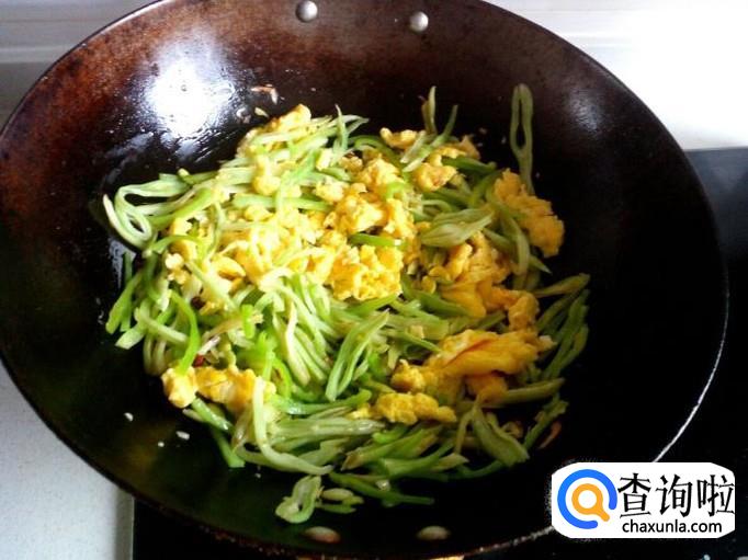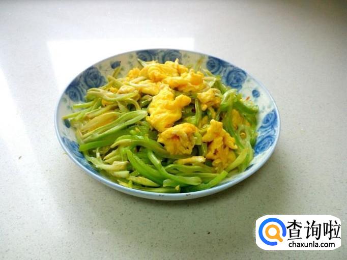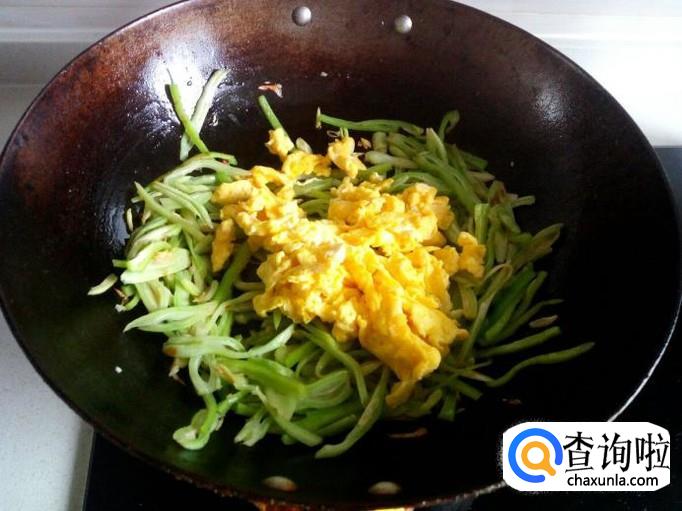 芸豆翻炒至断生,放入青尖椒略翻炒一下,然后放入炒好的鸡蛋。