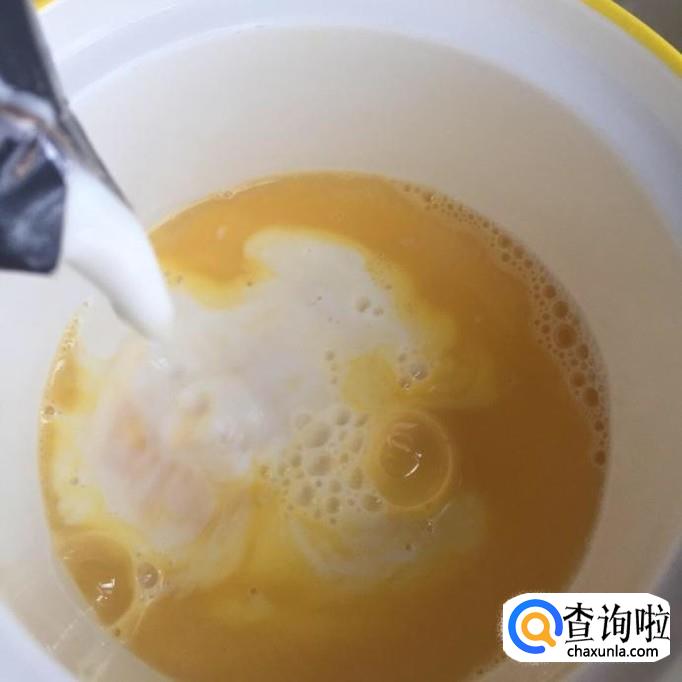 然后把牛奶放入微波炉加热片刻,然后把牛奶慢慢倒入蛋液中进行搅拌,搅拌均匀即可