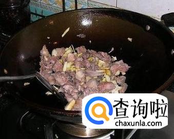锅中加油适量,油8分热时,我们加入兔肉爆炒,炒至兔肉完全变色时加入姜,炒香。
