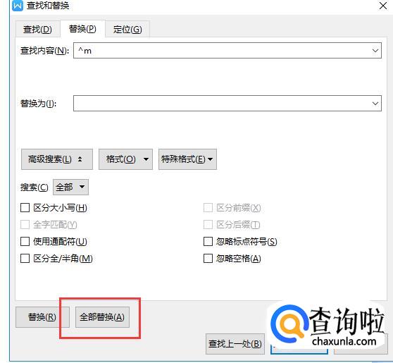 删除分页符时,按ctrl+F,然后点击替换,点击高级搜索。