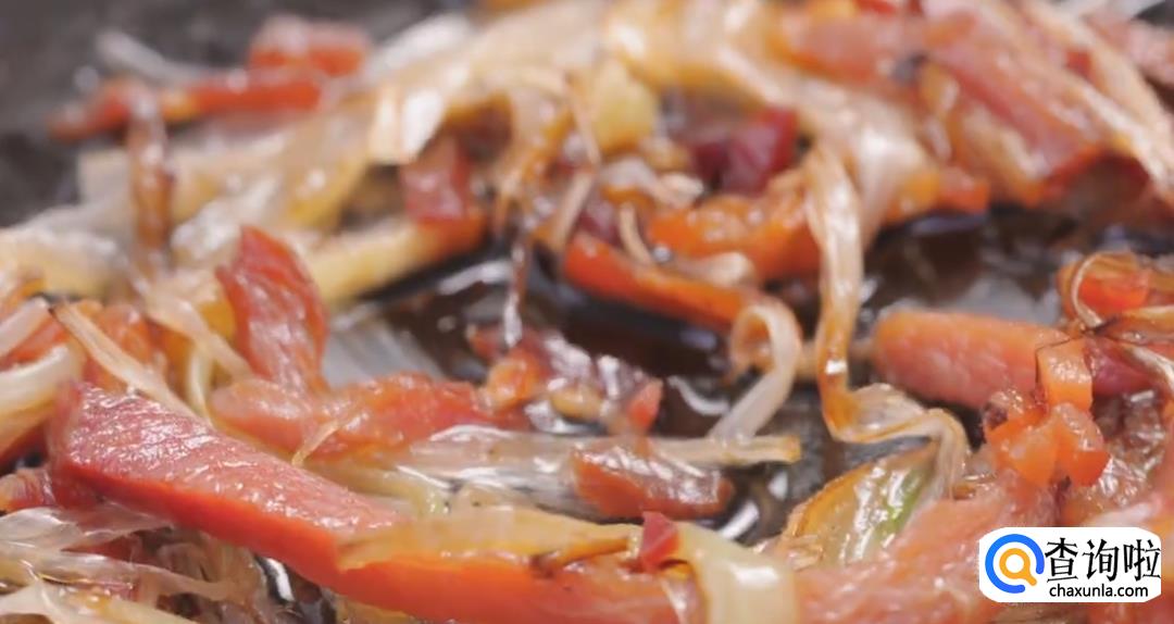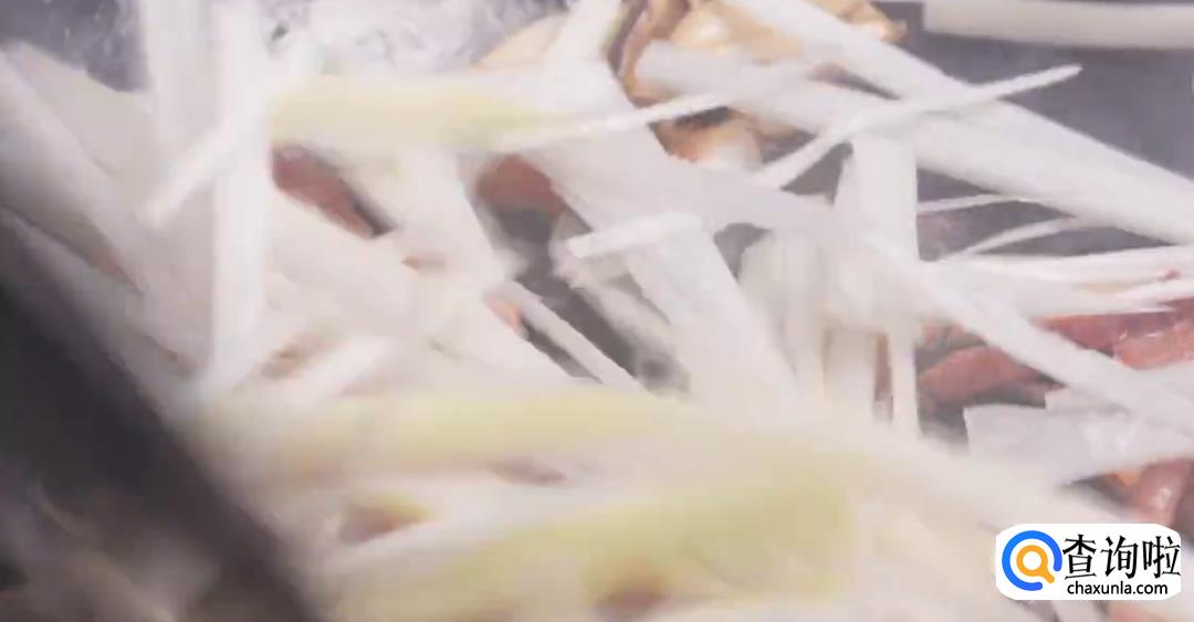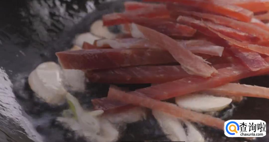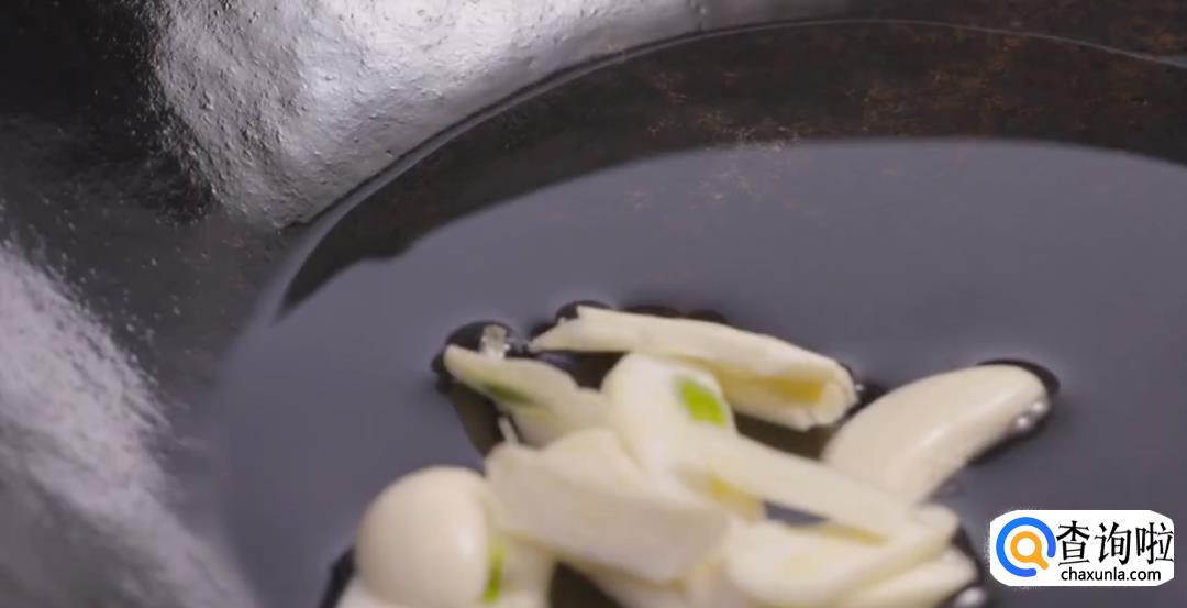 热锅起油,倒入蒜瓣,火腿丝爆香,加葱白持续爆炒至断生即可。