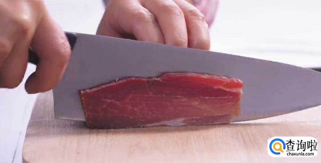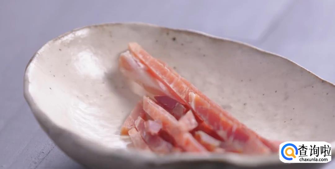 选取火腿中方部位,切成均匀的薄片,再用一小块切丝备用。