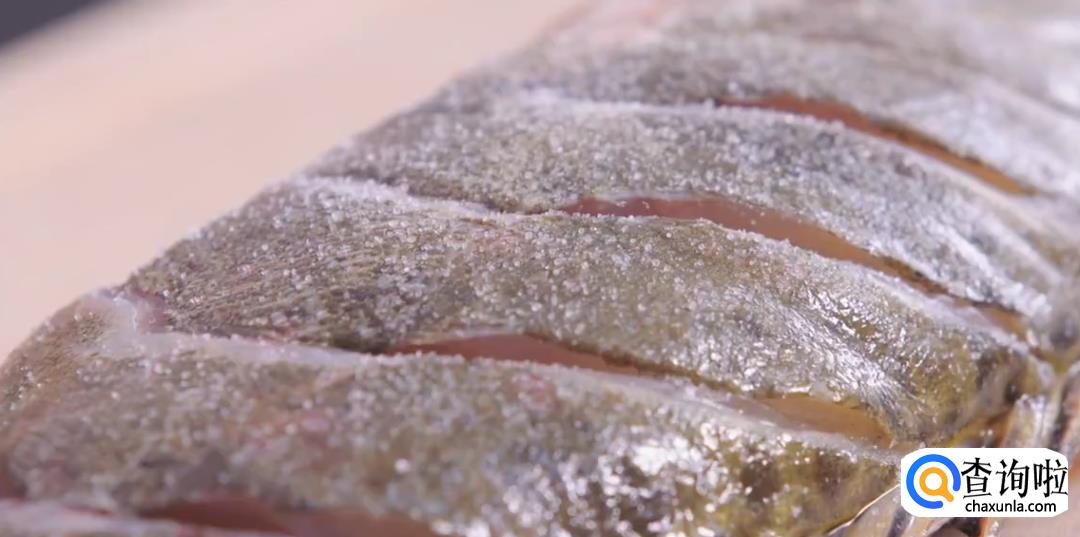 在鱼身上撒一层薄盐,切口和鱼肚子内都要涂抹均匀,然后腌制10分钟。