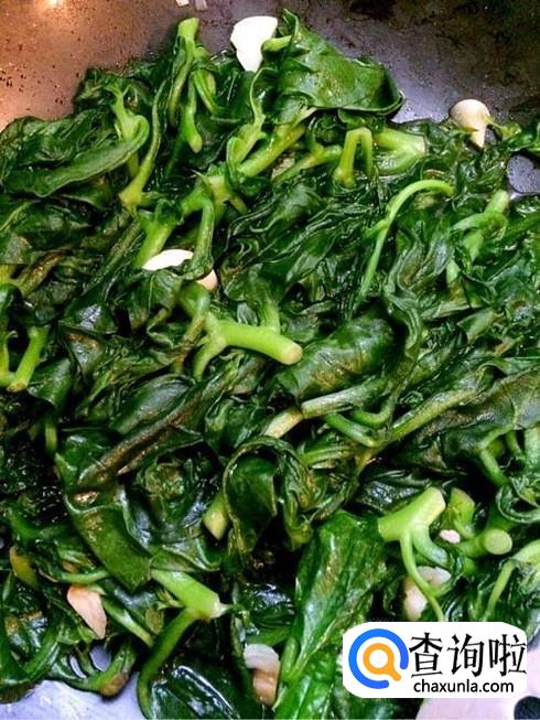 最后葱姜蒜爆香后加入切好的猫儿菜翻炒,等猫儿菜变软后加入盐、蚝油翻炒几下就可以出锅了。
