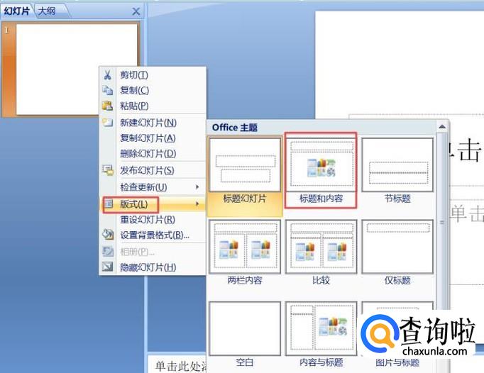 然后我们右击幻灯片,弹出的界面,我们将鼠标放在版式的地方,弹出的界面,我们点击选择一个我们需要版式,此处我们选择标题和内容,这个是常用的;