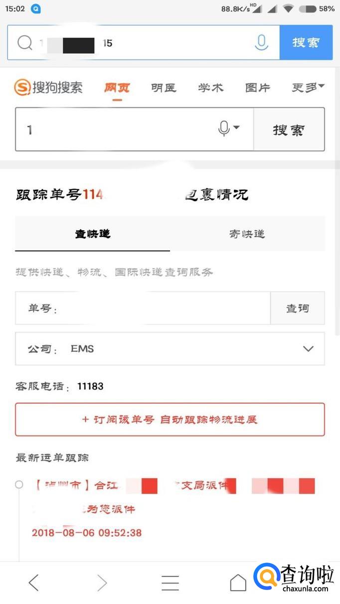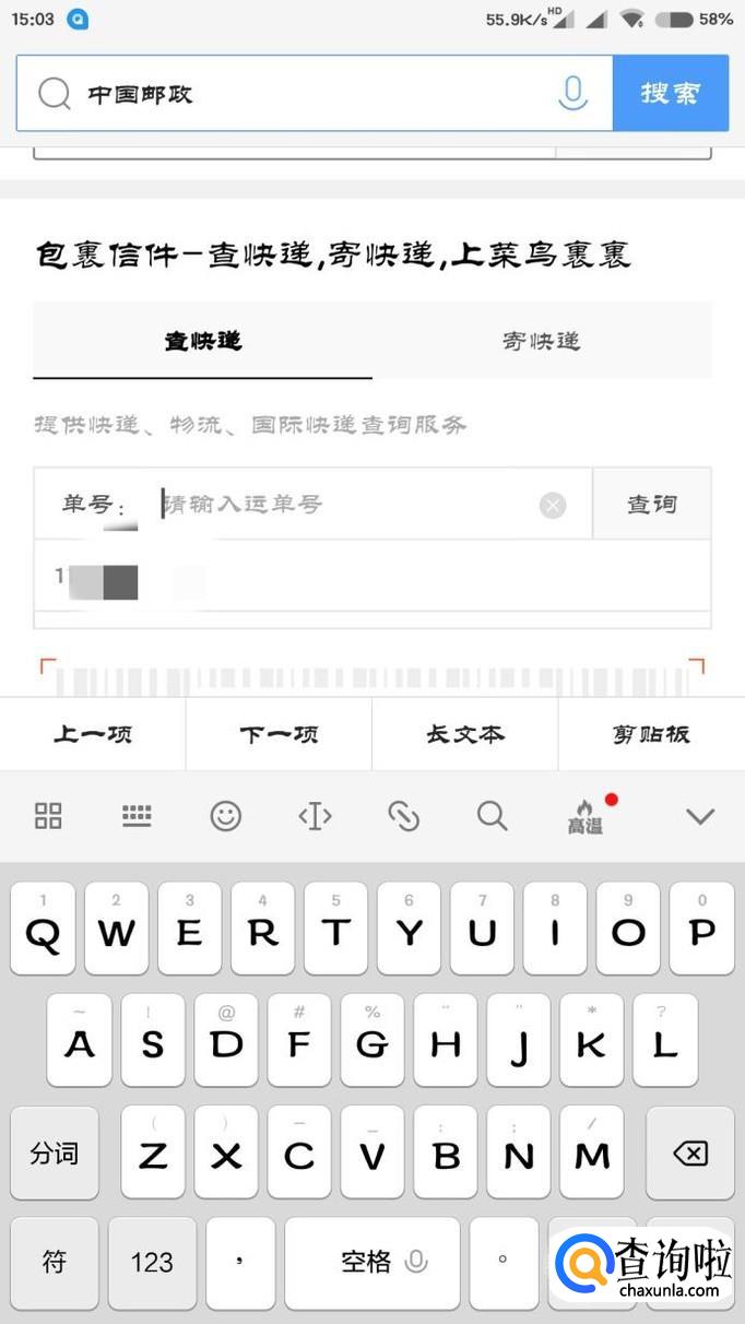 搜狗搜索“中国邮政”,在第一个检索项的输入框中输入中国邮政快递单号。
