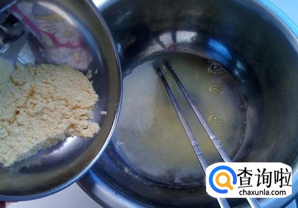 在盆内放入少许水,一点点放入玉米面搅拌均匀,一边放一边搅拌,防止出现面疙瘩。