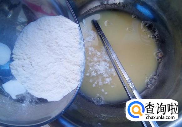 之后再一点点放入白面粉搅拌,边放边搅拌均匀。