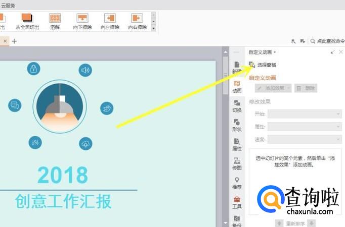 接着选择 自定义动画 选项,软件右边就会弹出动画自定义窗口