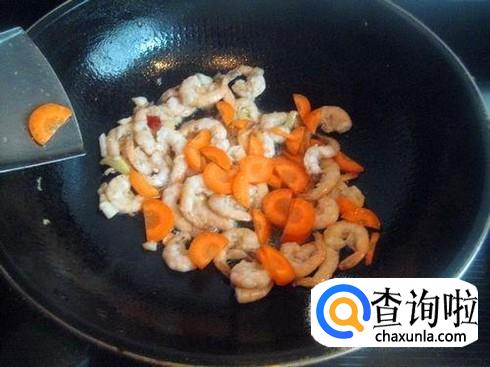 锅里放油,把虾仁放进去炒,虾仁变色之后将一点点胡萝卜丁放进去一起翻炒,直到胡萝卜丁变软。