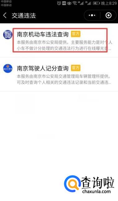 弹出的界面,我们点击南京机动车违法查询;
