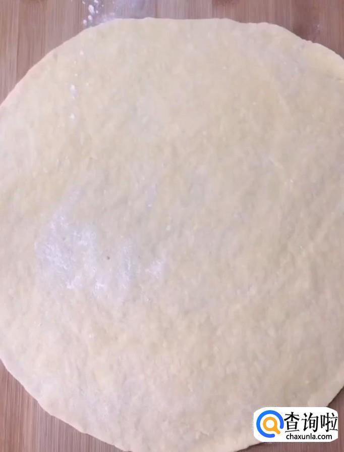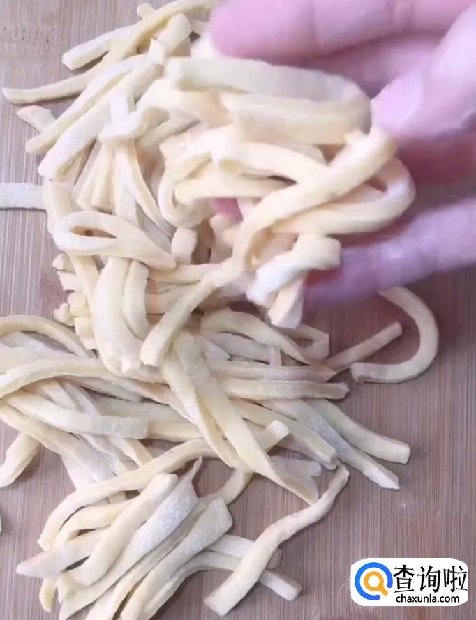 接着用擀面杖擀成大饼,用刀把饼切成长条