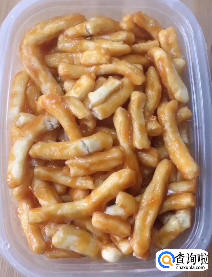 接着我们再把炸好的长条放入锅中,翻拌均匀放入容器中放凉
