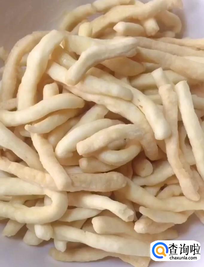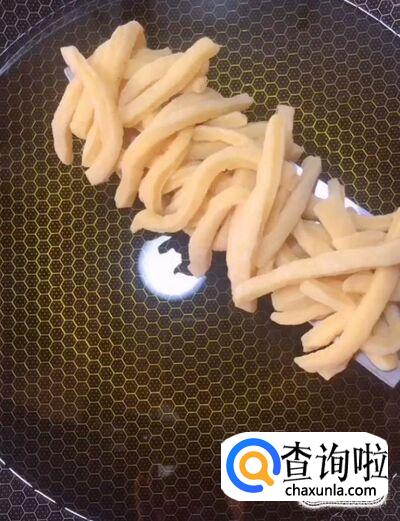 然后我们起锅烧油,油温五成热,把长条放入锅中,炸至飘起,备用