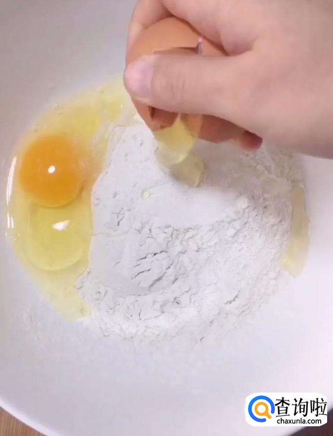 首先,我们在碗中放入适量的面粉,打入两个鸡蛋