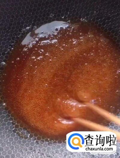 然后我们在一个干净的锅中,倒入一碗水,一碗白糖,开小火,熬至焦糖色关火