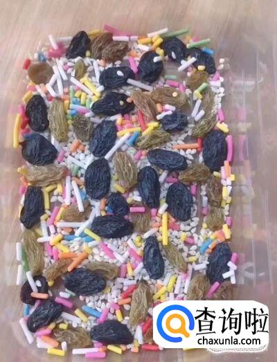 接着我们准备一个容器,撒上自己爱吃的坚果与芝麻
