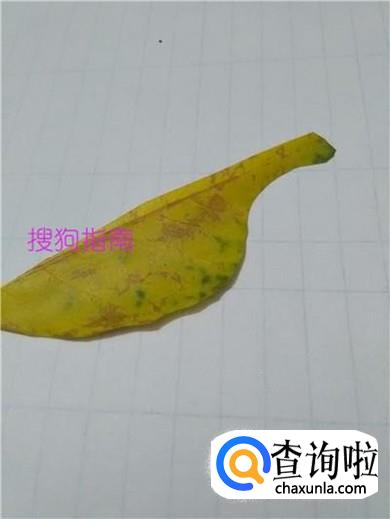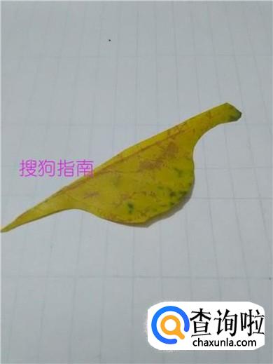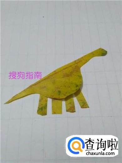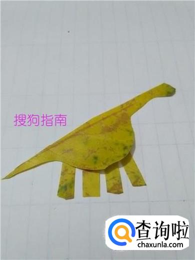 从另一半树叶上剪四个长方形,当作蛇颈龙的四条腿,把四条腿粘在肚子下面,树叶恐龙就做好了。