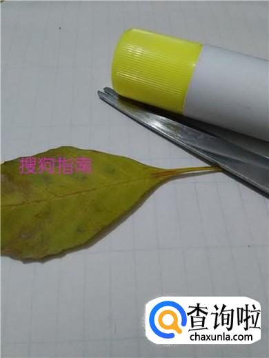 准备一张纸,一片树叶,一把剪刀,一个胶棒。