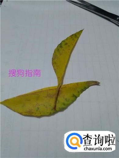 先用剪刀顺着叶脉把树叶剪成两部分。